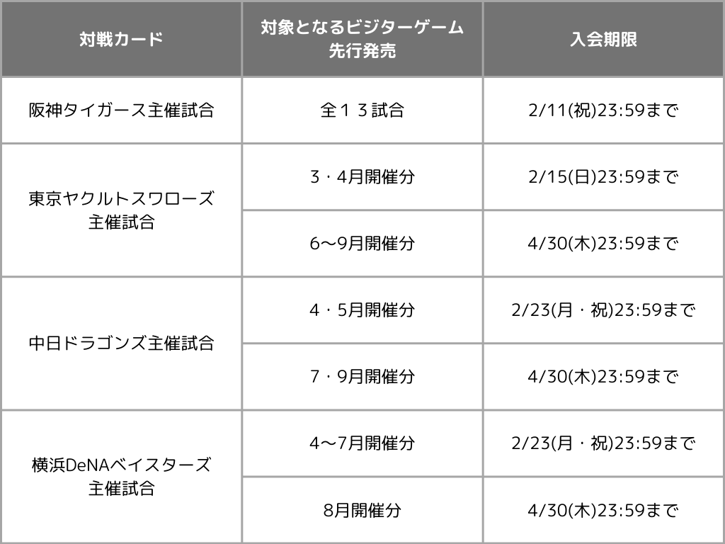 ファンクラブ入会時期に対してどの試合の先行発売から購入対象となるかは球団毎に異なりますので、下記をご参照ください。